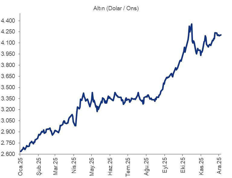 Amerikan tahvil faizlerindeki geri çekilme ve Dolar endeksindeki değer kaybı altın için destekleyici olurken, Fed üyelerinin faiz indirimlerine sıcak baktıkları yönündeki açıklamaları da altına olumlu yansıdı. Yılbaşından bu yana %61,5 değer kazanan ons altın, kasım ayında %5,9 değer kazanarak ayı 4.239 seviyesinde tamamladı. Gram altın ise 5.763 TL seviyesine yükseldi.
