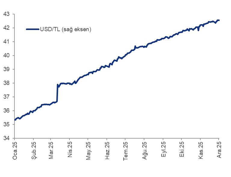 Türkiye ekonomisi, yılın üçüncü çeyreğinde yıllık bazda %3,7 ile piyasa beklentisinin (%4,2) altında büyüdü. Böylece, ekonominin büyüklüğü 1,5 trilyon $’a yükseldi. 2025 yılının ilk iki çeyreğine ilişkin yıllık büyüme verileri sırasıyla %2,3’ten %2,5’e ve %4,8’den %4,9’a revize edildi. Yıllık bazda büyümenin sürükleyicisi yurt içi talep olmaya devam ederken, net ihracat negatif katkı yapmayı sürdürdü. Özel tüketim harcamalarının ikinci çeyreğe göre ivme kazanması iç talebin halen canlı seyrettiğini gösterdi. Öncü veriler ekonomik aktivitenin yılın son çeyreğinde de ılımlı seyrini koruduğuna işaret ediyor: 20 aydır daralma bölgesinde gerçekleşen imalat PMI endeksi kasımda 48 ile son 9 ayın zirvesine yükseldi. Faiz indirimlerinin devam ettiği senaryoda, ilerleyen dönemde de ekonominin potansiyeline yakın büyümesini bekliyoruz. Bu çerçevede, 2025 yılında büyümenin Orta Vadeli Program’da öngörülen %3,3 seviyesinin üzerinde %3,5 büyümesini bekliyoruz.
