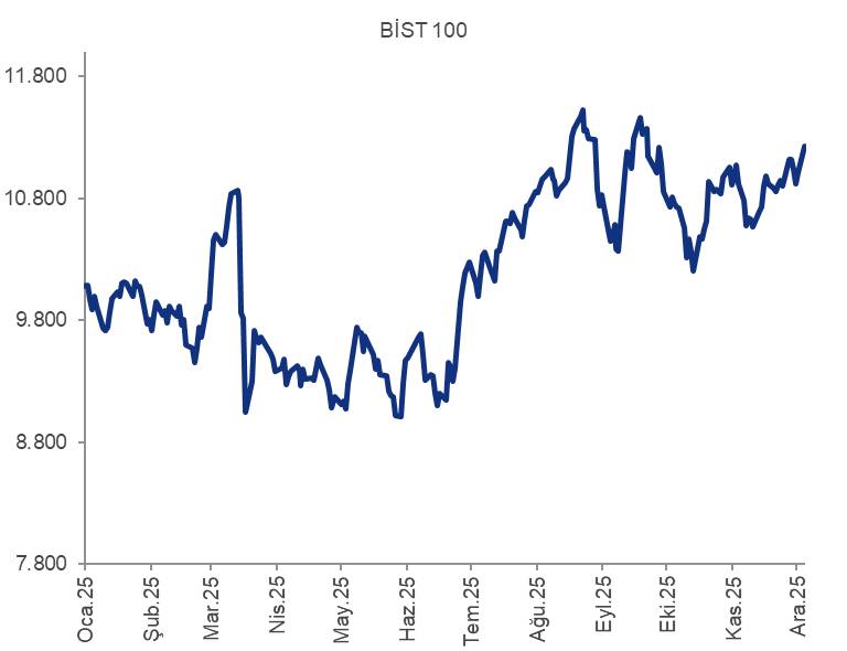 Kasım enflasyonuna ilişkin olumlu beklentiler ve Merkez Bankası Başkanı Karahan’ın iletişimi faiz indirim beklentilerini güçlendirdi. Borsa İstanbul kasım ayını yataya yakın hafif eksi kapatırken, enflasyon beklentilerindeki iyileşme ve para politikasına ilişkin beklentiler bankacılık sektörünün %6,43 yükselerek pozitif ayrışmasına neden oldu. 28 Kasım ile biten haftada hisse senedi piyasasından 9 milyon $ çıkış gerçekleşti. Sene başından bu yana toplam yabancı girişi 1,245 milyar $’a oldu. Hisse senedi piyasasında yabancı oranı ise kasım sonu itibarıyla %36,56 seviyesinde.
